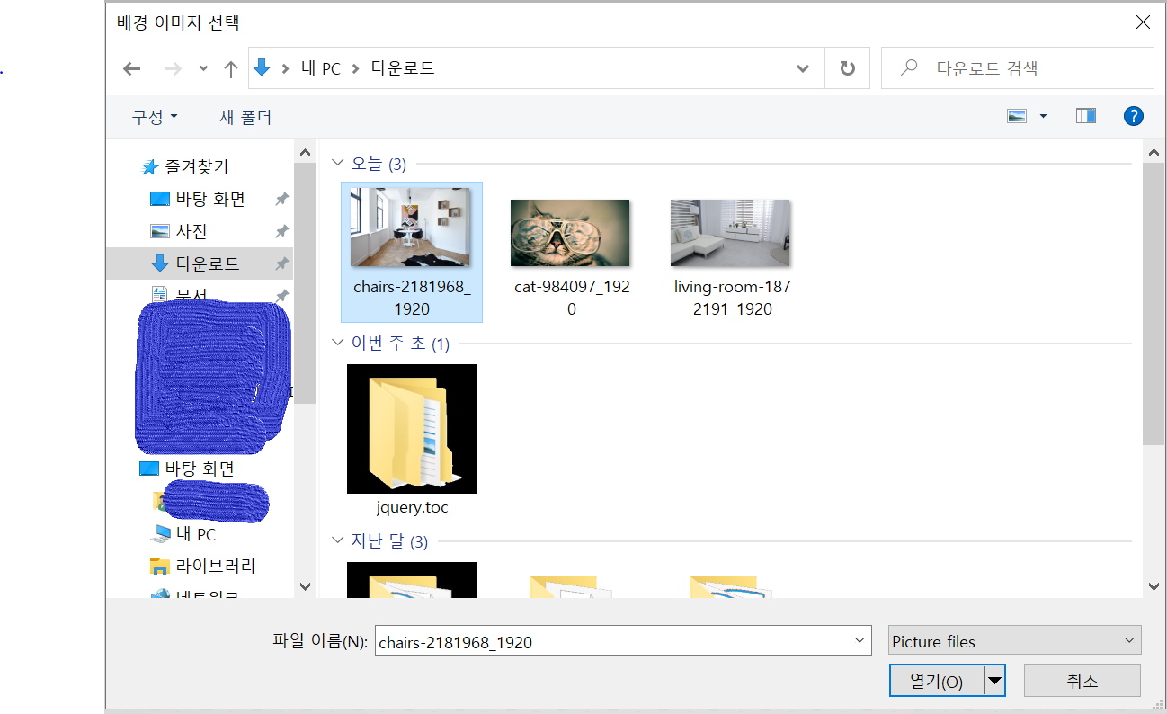 5. 이미지 추가를 선택하면 아래처럼 어떤 폴더에서 배경이미지를 가져올 것인지 배경 이미지 선택 창이 뜨게 됩니다. 배경으로 사용하고자 하는 사진이 있는 폴더를 클릭하여 원하는 사진을 선택 후 [열기]를 클릭합니다. 원하는 사진을 더블 클릭하여도 사진을 업로드할 수 있습니다.