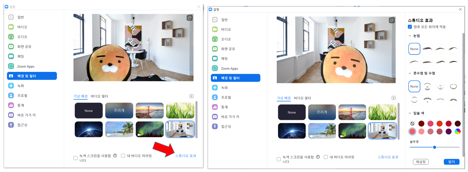 8. 다음은 스튜디오 효과로 화장을 한 것처럼 만들 수가 있답니다. [배경 및 필터] 화면에서 우측 맨 아래 [스튜디오 효과]를 클릭합니다. 눈썹, 콧수염, 입술 색깔 등을 선택할 수 있습니다. 자신의 얼굴에 잘 맞는 효과를 선택해 놓으며 좋을 것 같아요.