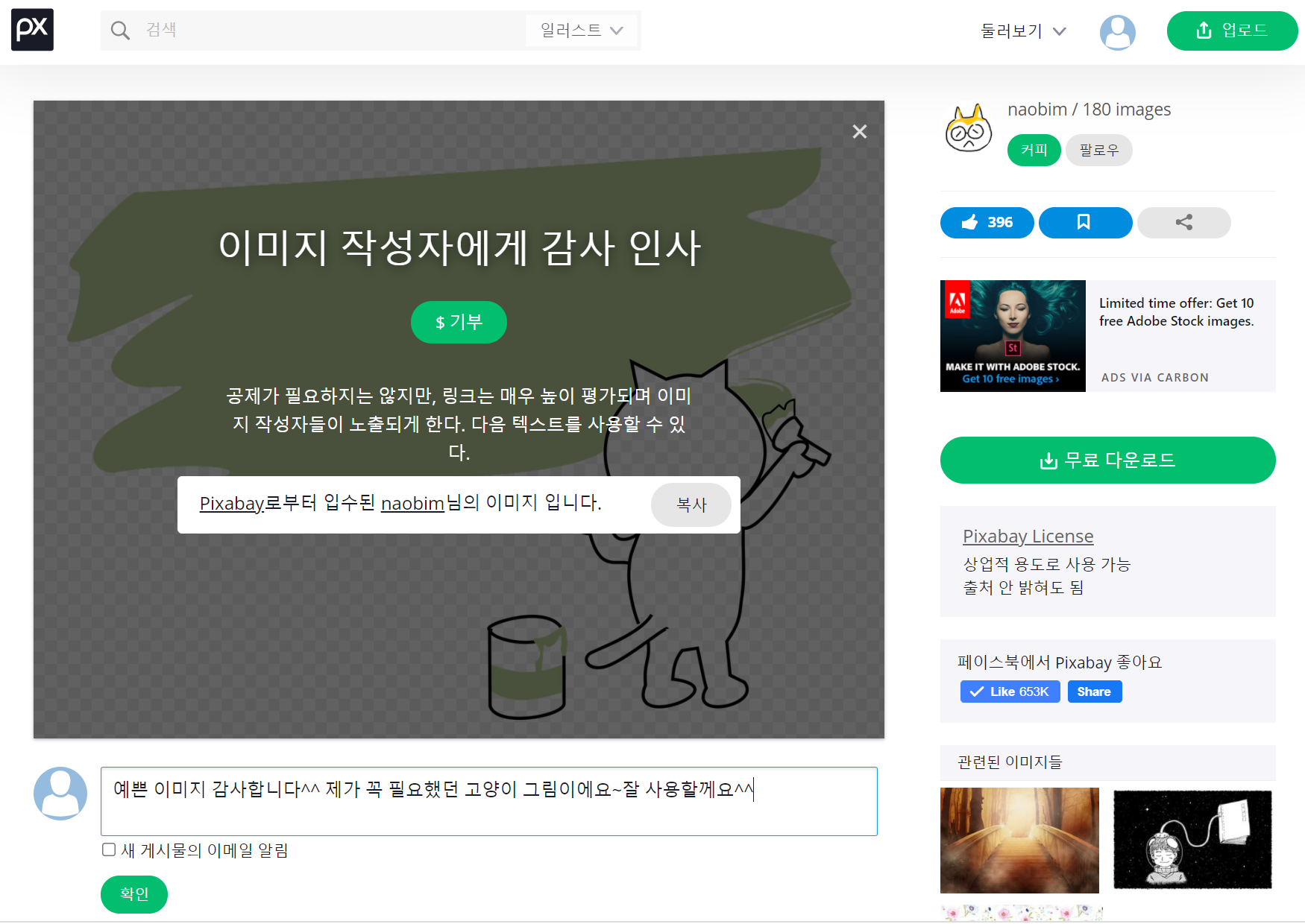 PixaBay는 회원가입을 하지 않아도 무료 사진들을 다운로드하여 사용할 수 있습니다. 많은 분들이 재능 기부를 해주시고 계신 거죠.