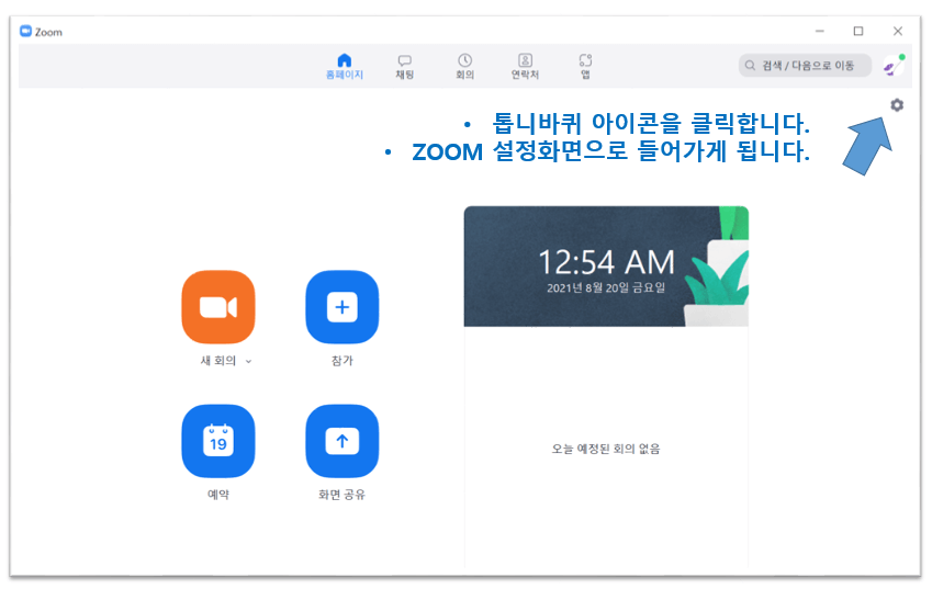 2. Zoom 클라이언트 화면의 우측 맨 위의 톱니바퀴 아이콘을 클릭합니다. Zoom 설정 화면으로 들어가게 됩니다.