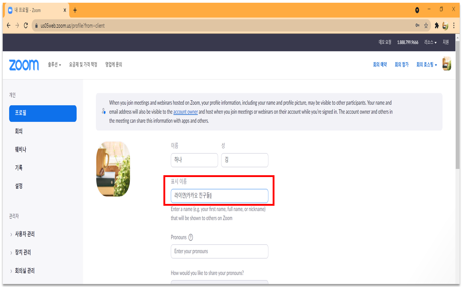 3. 편집 화면에 들어가면 표시 이름을 변경할 수 있습니다. 원래 [하나 김]으로 되어 있는 것을 [라이언(카카오 친구들)]로 변경해보았습니다.