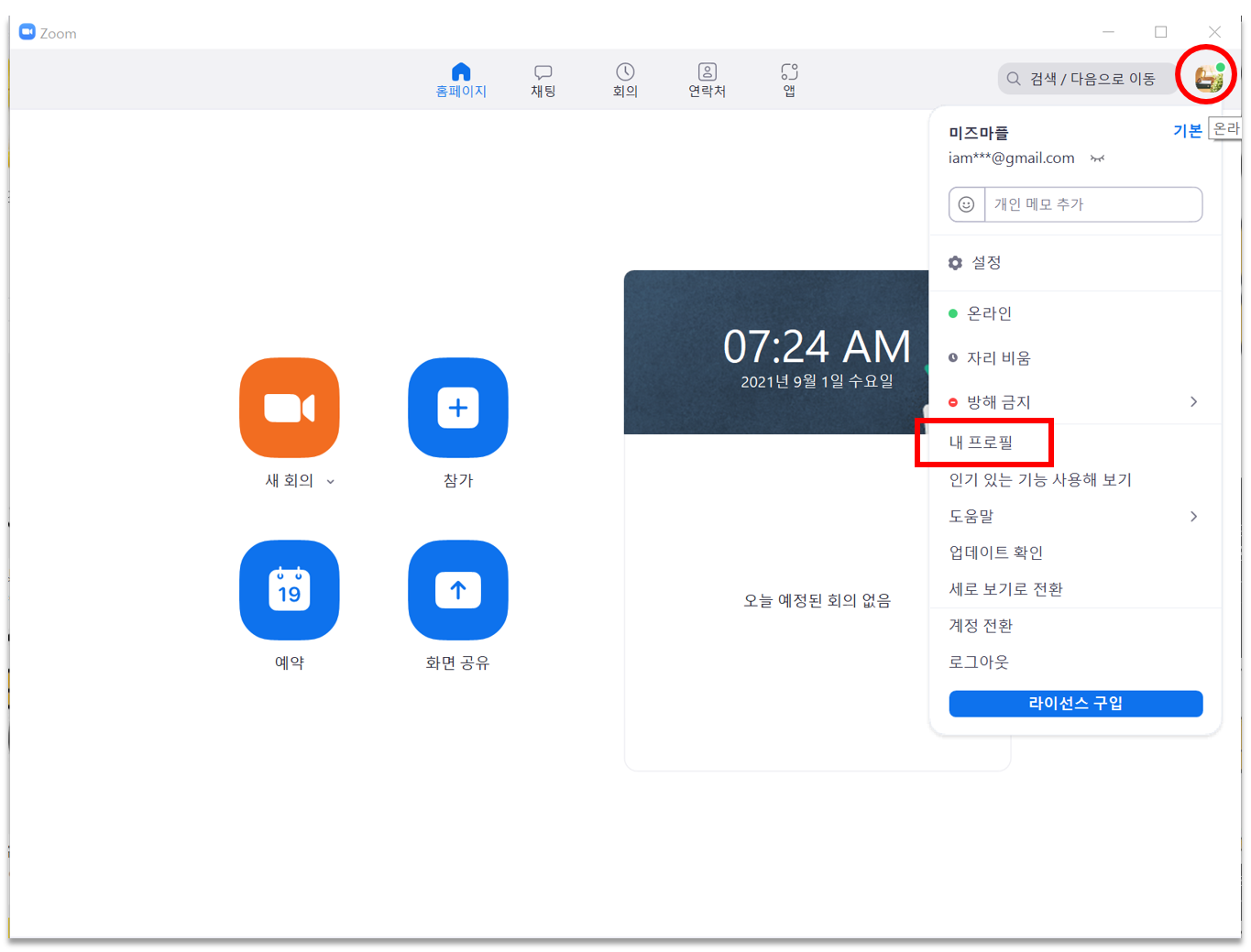1. ZOOM Meetin에서 맨 우측 검색란 위에 내 이메일 로그인 아이콘(빨강 동그라미 안)을 클릭하면 아래 그림과 같이 설정을 변경할 수 있는 메뉴가 보입니다. 중간에 있는 [내 프로필](빨강 네모 박스)를 클릭합니다.