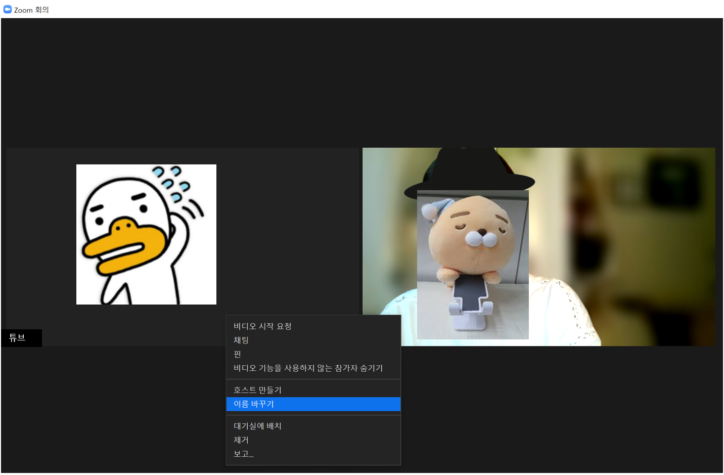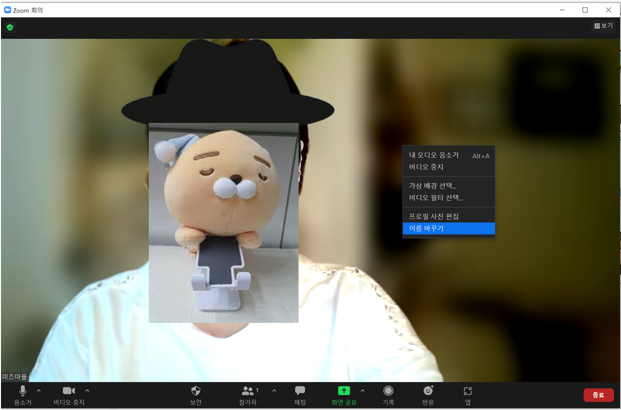 회의 화면에서 내가 보이는 화면 아무 곳에나 마우스를 놓고 우클릭을 하면 아래와 같에 메뉴가 생성됩니다. 맨 아래 [이름 바꾸기]를 클릭합니다.