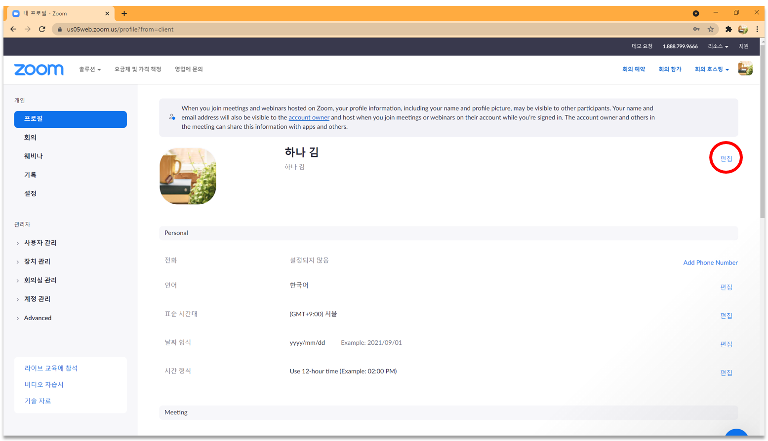 2. ZOOM 홈페이지로 [내 프로필] 화면으로 들어가게 됩니다. 우측 화면에 [편집](빨강 동그라미)이라고 작은 글씨가 보입니다. 이 편집을 클릭합니다.