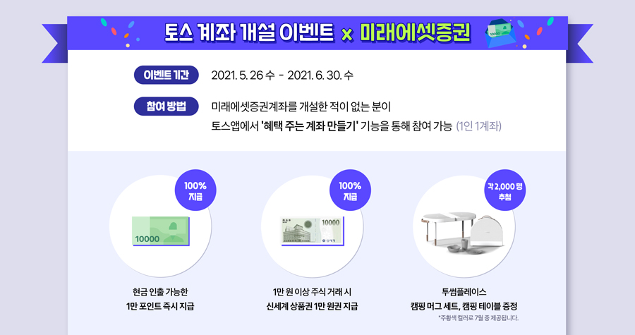 이번 달(2021. 9.1~9.31까지) 토스를 이용해 미래에셋증권 주식계좌를 개설하면 1만 원 지급과 주식거래를 1만원 이상 하면 토스에서 1만원 추가 지급하는 행사예요. 요즘 공모주 청약을 위해 주식계좌들을 많이 만들고 있을 실 텐데요. 미래에셋 주식계좌가 없다면 이번 행사를 이용해도 좋을 것 같아요. 저는 아쉽게도 이미 있어서 신청을 못한답니다.