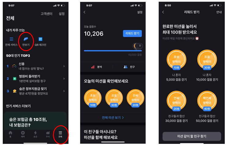 저녁에 토스 앱을 열어 화면 맨 아래 우측의 세줄 표시 아이콘(보통 점 세 개, 줄 세 개는 그 안에 무언가 있다는 것을 표시해 주죠) 누르면 아래 첫 번째 그림과 같은 화면이 나옵니다. 맨 위에 내가 자주 쓰는 항목이 보이죠? 저는 만보기와 요즘에는 방명록 대신 사용하는 코로나 QR체크인을 가장 많이 사용해서 맨 위에 내가 자주 쓰는 항목에 보여요. 처음 만보기를 사용하시는 분은 화면을 스크롤해서 맨 아래로 내려가다 보면 만보기 항목이 나올 거예요.