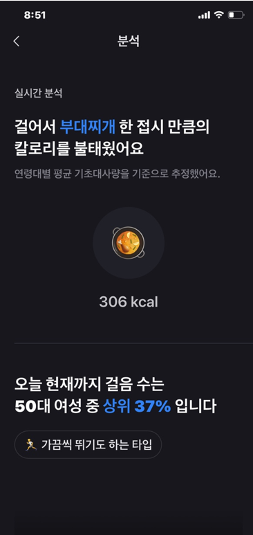 화면에서 [공유]하기를 클릭하면 아래와 같이 분석된 내용이 나오는데 저는 오늘 걸어서 부대찌개 한 접시만큼의 칼로리를 불태웠습니다. 그리고 50대 여성중 상위 37%의 걸음수를 걷고 있다고 합니다. 50대 중에서 저보다 많이 걷는 분들이 37%나 된다고 하네요. 조금 더 분발해야 할 것 같아요.