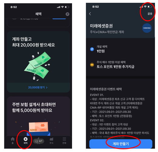 방법은 토스 앱에서 맨 아래 메뉴 탭 2번째에 [혜택]을 누릅니다. 그럼 2번째 사진처럼 미래에셋증권 계좌 만들기 화면이 뜹니다. 아래 [계좌 만들기]를 클릭해서 순서대로 진행하면 됩니다. 그리고 맨 위 우측의 [공유]를 누르고 카카오톡 나에게 문자를 보내면 자세한 내용을 확인할 수 있습니다. 다른 사람에게 좋은 정보를 보내 줄 수도 있습니다.