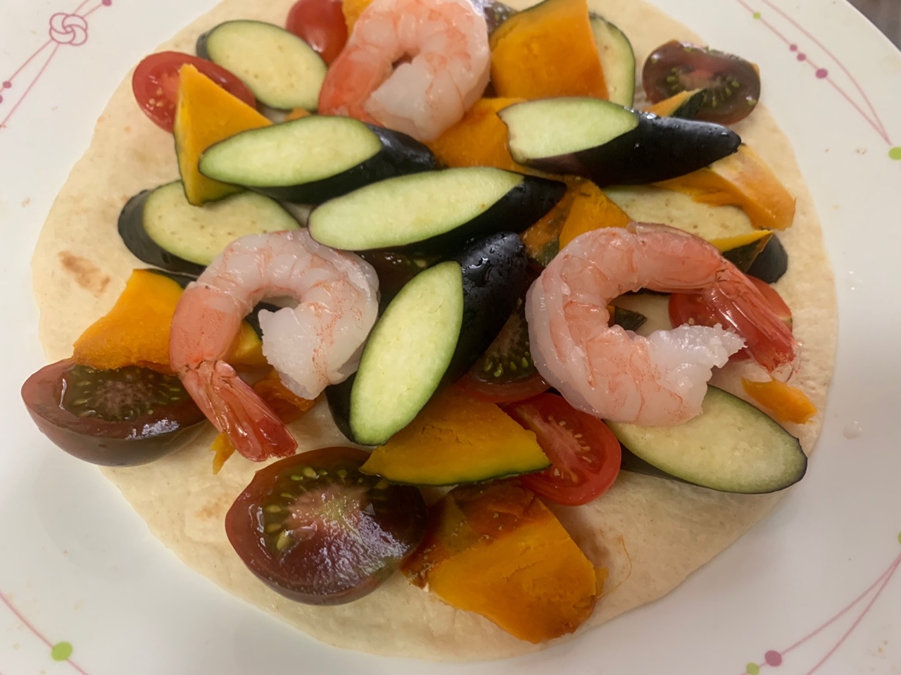 냉장고에서 꺼낸 재료를 잘라 넓게 펼처줍니다. 오늘 제 냉장고에는 방울토마토, 가지, 단호박과 칵테일 새우 3개가 있어서 이것을 올려 주었습니다.