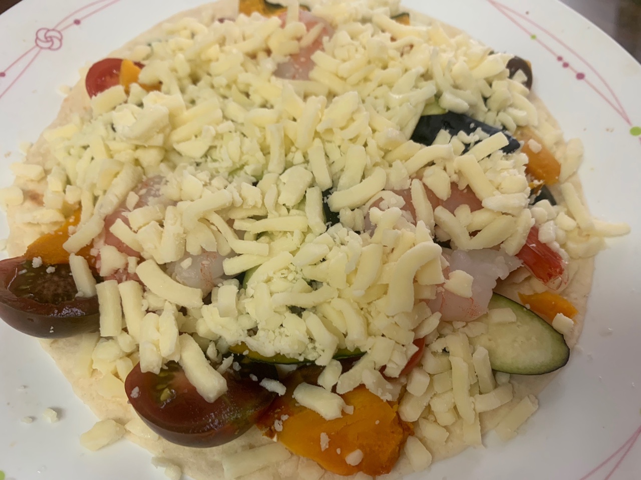 냉장고에 있는 재료 아무거나 사용해도 좋아요. 버섯, 양파, 옥수수, 아보카도 등등. 평소 먹는 피자와 비슷한 느낌으로 먹으려면 토마토 페이스트나 토마토 스파게티 소스를 또띠아에 발라주면 됩니다. 토마토소스의 풍미가 훨씬 깊게 느껴집니다. 담백한 맛을 좋아하거나 토마토 소스 향을 좋아하지 않는다면 이 과정을 생략해도 괜찮은 것 같아요~