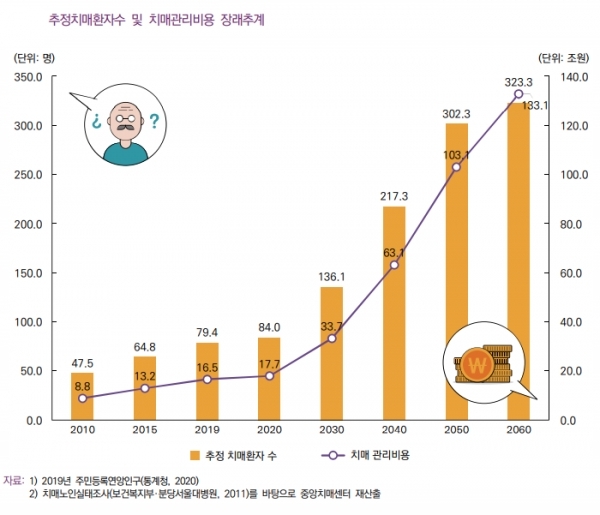 우리나라 자료를 살펴보면 2021년 4월에 중앙치매센터에서 발간한 '2020 대한민국 치매 현황'에서 2019년 연간 치매로 인한 관리비용이 16조 5천억 원이 소요되었는데 이는 같은 해 국내총생산 1,919조 원으로 치매환자 관리 비용이 0.86%를 차지하였습니다. 이는 치매환자 1인당 비용으로 환산하면 2,772만 원이고, 특히 중증 치매환자에게 사용된 비용은 3,029만으로 경증 환자 대비 2배의 비용이 든다고 합니다. 인구 고령화로 인해 치매환자가 기하급수적으로 늘어날 것으로 예상되고 이에 따라 관리 비용이 급증할 것으로 예측되고 있습니다.