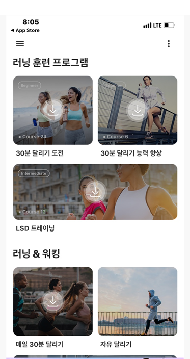 로그인하고 어플에 입장하면 다양한 러닝 훈련 프로그램과 워킹 프로그램이 있습니다. 원하는 프로그램을 다운로드하여 사용하면 됩니다. 하나씩 활용해보면 건강관리에 도움이 될 것 같습니다. 걷기 운동을 어느 정도 하다 보면 힘도 들지 않고 조금 숨찬 느낌의 중강도 이상 운동을 시작하고 싶은 시기가 옵니다. 이때쯤 활용하면 도움이 될 것 같습니다.