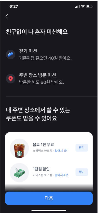 친구 없이 나 혼자 미션 해요 걷기 미션, 기존처럼 걸으면 40원 받아요 주변 장소 방문 미션, 방문만 해도 60원 받아요 내 주변 장소에서 쓸 수 있는 쿠폰도 받을 수 있어요.