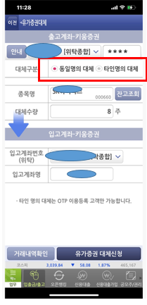 2. 동일명의 대체인지, 타인명의 대체인지 선택합니다(타인 명의 대체인 경우는 증권사에서 확인 전화가 온다고 합니다).