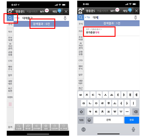 그리고 검색(돋보기 아이콘)을 클릭하여 검색어를 [대체출고]로 입력합니다. 검색 결과가 0건입니다(좌측 그림). 그래서 잘못했나 하고 다시 [대체]를 쓰는 순간 아래 검색 결과에 [유가증권 대체]가 검색됩니다. 아래쪽 검색결과 [유가증권 대체]를 클릭해서 들어갔습니다.