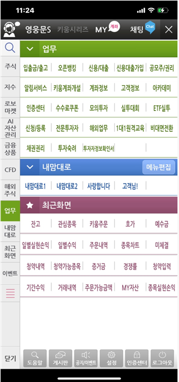 전체 메뉴 화면으로 들어가야 합니다. MTS 좌측 맨 아래에 [세줄 메뉴 탭]을 클릭합니다.
