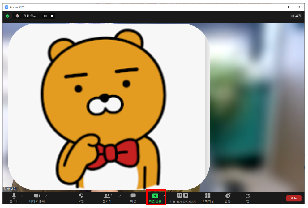 1. 줌 프로그램에 입장하여 [화면 공유]를 클릭합니다. 내가 호스트가 아니라면 화면 공유를 할 수 있도록 호스트에게 요청해야 합니다.