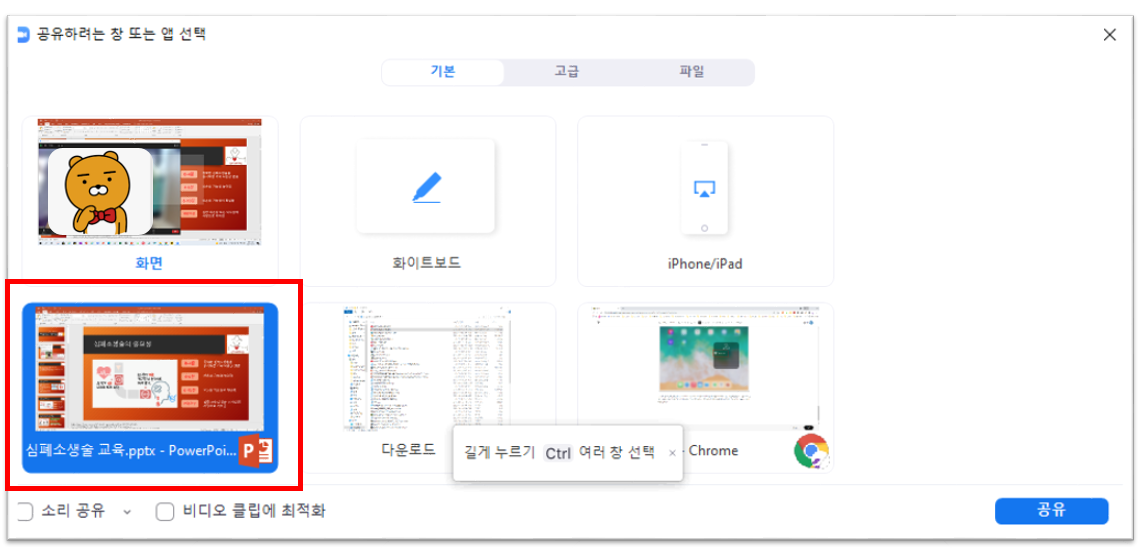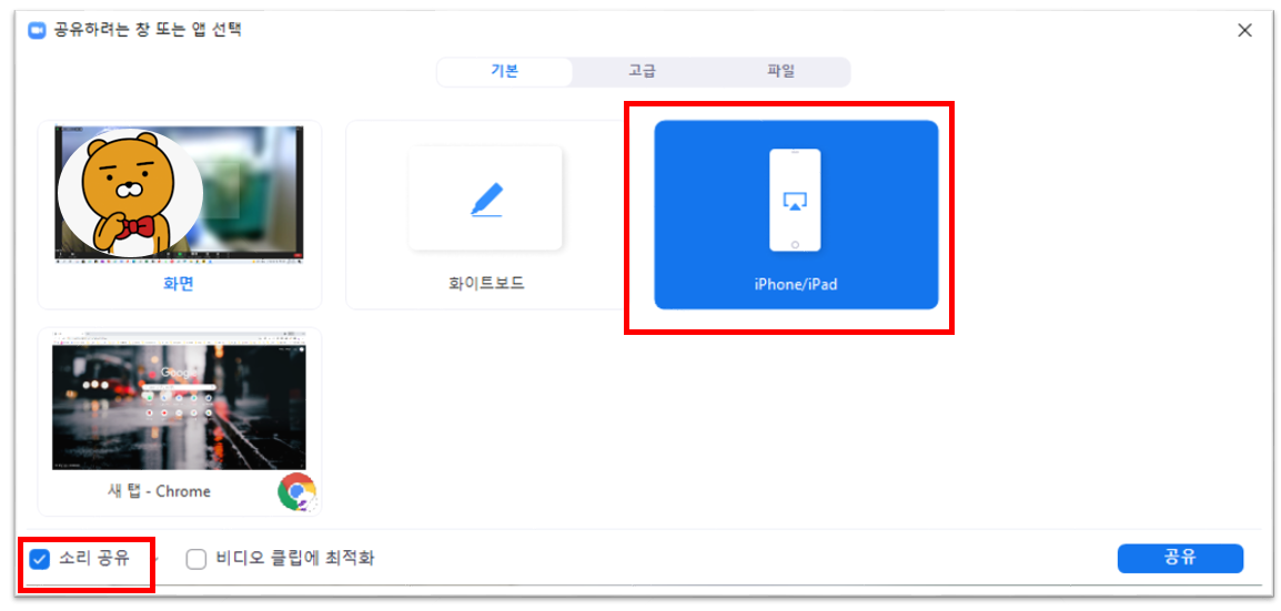 2. 공유하려는 창을 선택하는 화면이 나옵니다. [iPhone/Pad]를 선택합니다. 만일 발표 중에 유튜브나 음악을 들려줄 거라면 아래 족 [소리 공유]도 체크해줍니다. 우측 아래 [공유]를 클릭합니다.