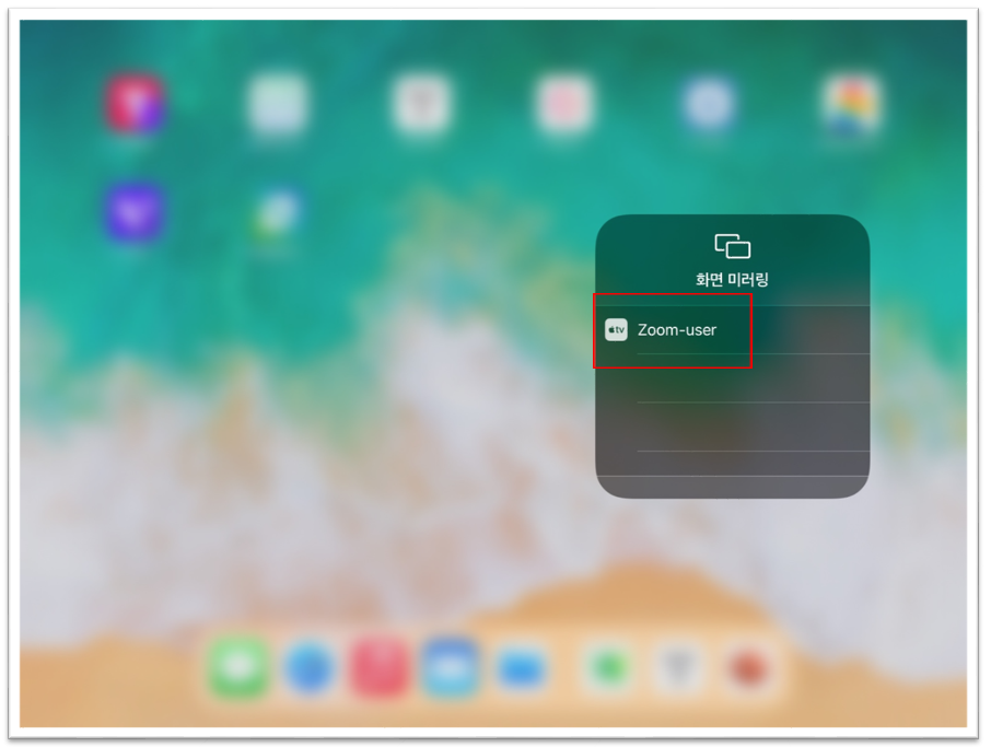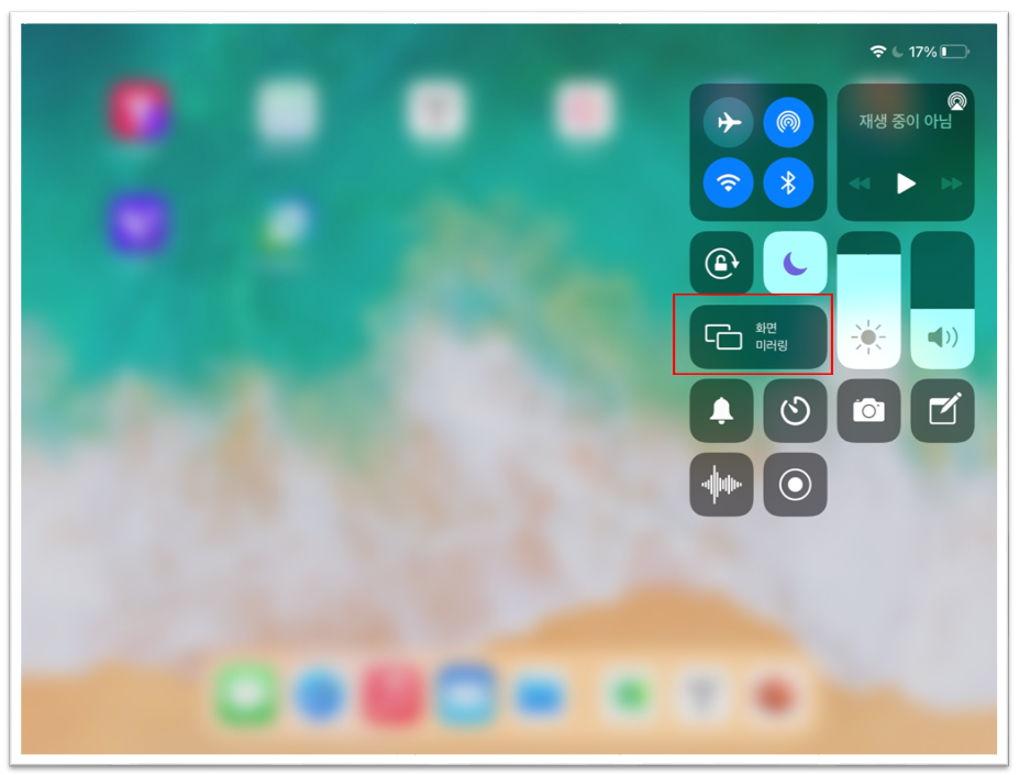 5. 아이패드 화면을 위에서 쓸어내리면 간편 메뉴들이 나타나는데 [화면 미러링]을 선택합니다. iOS 11 이후부터는 화면 하단에서 위로 밀어 올립니다.
