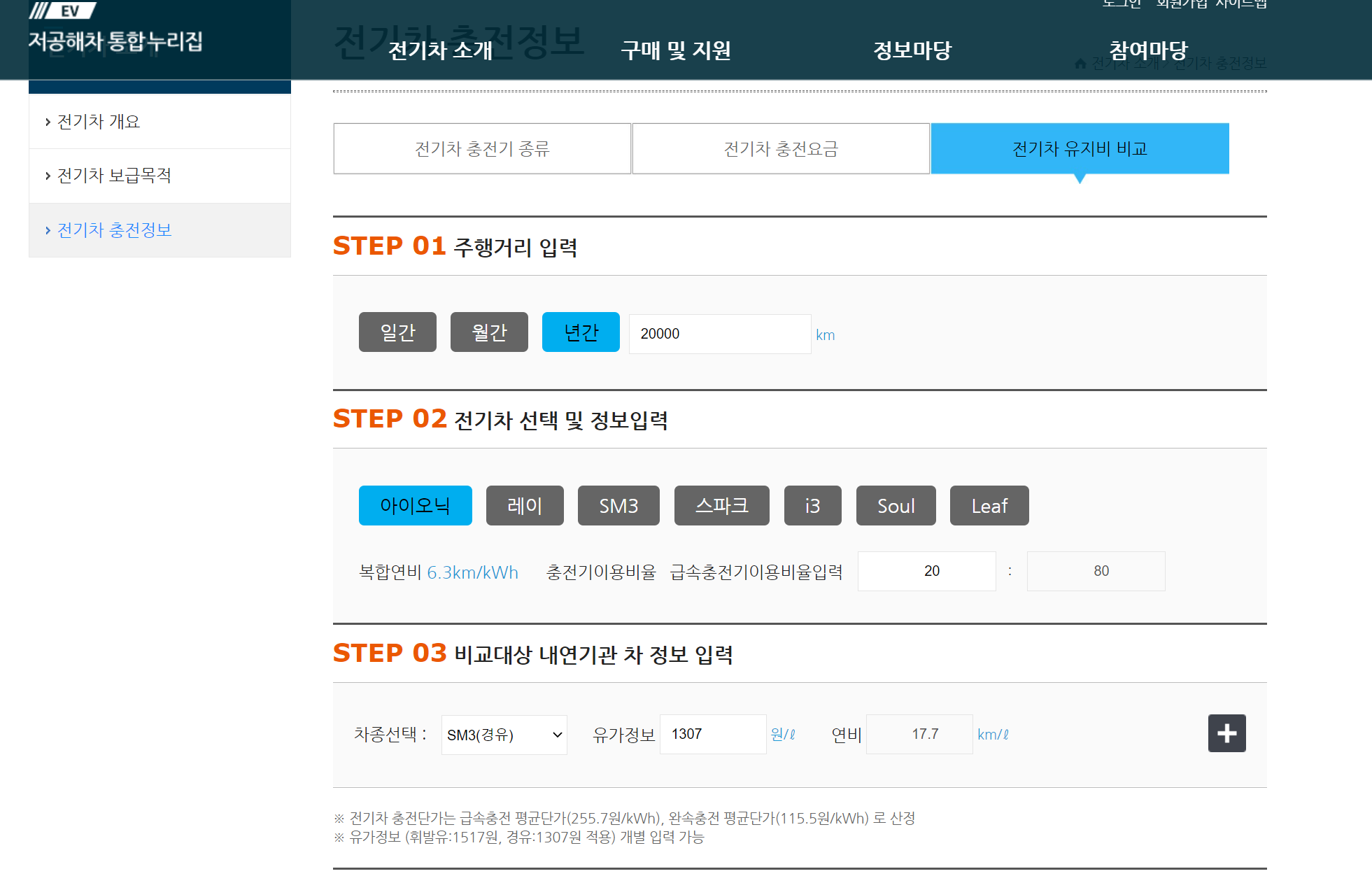 전기차 유지비와 내연기관차 유지비를 비교할 수 있는 기능이 있습니다. 1년간 2만 킬로미터를 운행한다고 했을 때 아이오닉과 소울 경유차를 비교하여 보았습니다. 비교해볼 내연기관차 종류가 다양하지는 않지만 전기차 유지비가 저렴하기는 합니다. 또 전기차 배터리는 온도에 따라 전력 효율이 다르므로 참고하는 데 사용하기 바랍니다.