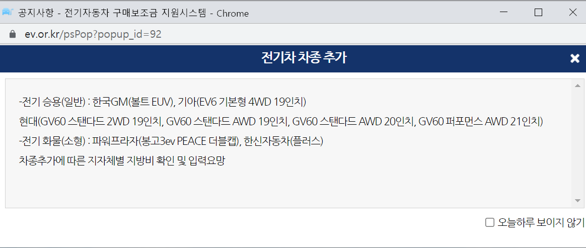 최근 GV60 등 구매보조금 신청이 가능한 차종이 추가되었습니다. 제가 구매를 고려하는 제네시스 GV60도 추가되어 홈페이지에 들어가니 팝업창으로 공지되고 있습니다.