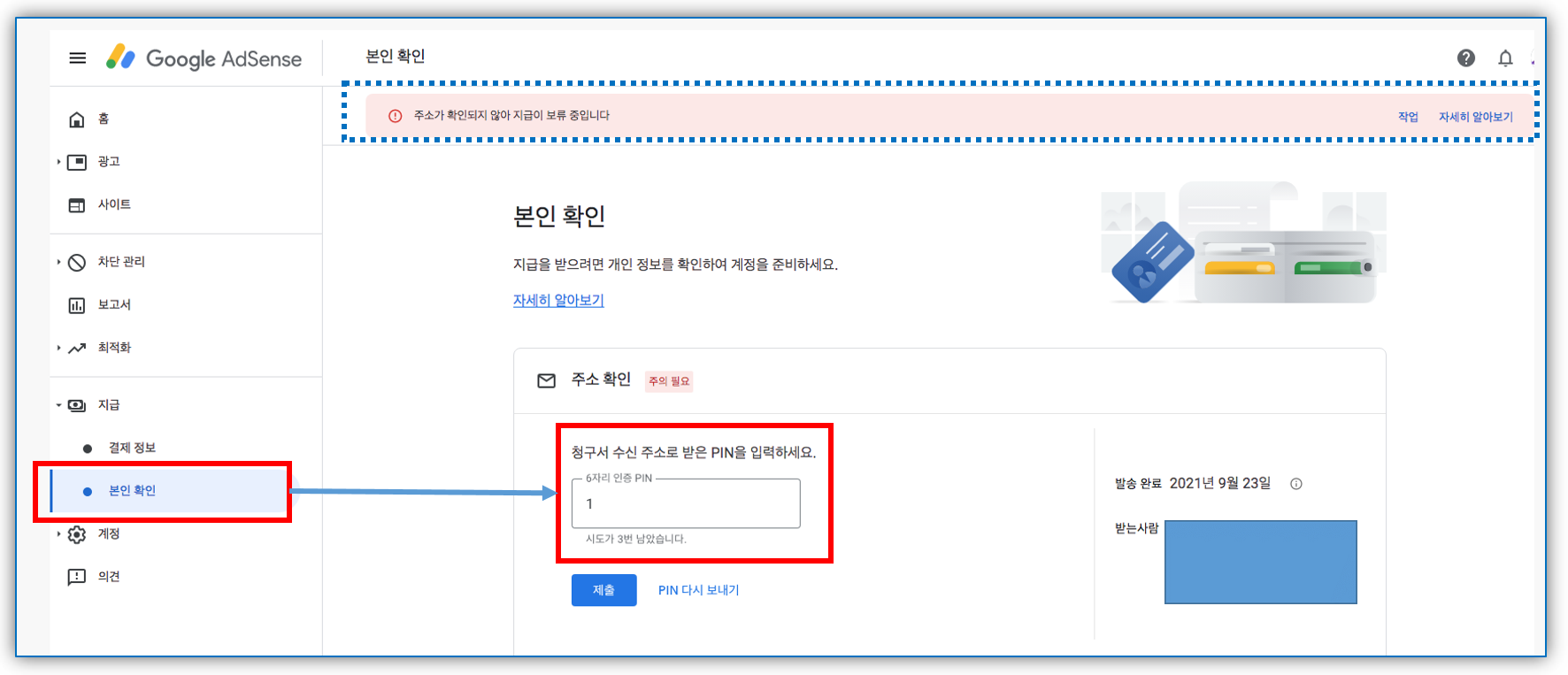 구글 애드센스에 로그인합니다. PIN번호를 입력하지 않았을 때는 맨 위 파란 점선 안에서처럼 [주소가 확인되지 않아 지급이 보류 중입니다.] 라는 메시지가 떠 있습니다. PIN번호를 입력하면 이 알림 메시지가 사라집니다.