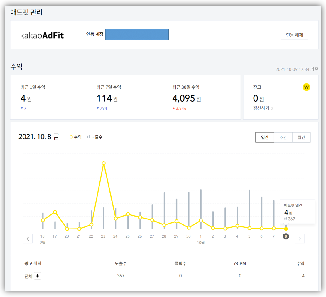 구글 애드센스보다 먼저 승인된 애드핏 수익은 4,095원입니다. 정말 구글 애드센스 광고 단가가 훨씬 큰 것 같습니다. 구글 애드핏은 5만 원 이상이 되어야 지급 신청이 가능하므로 1년은 지나야 수익금 지급 신청이 가능할 것 같습니다.