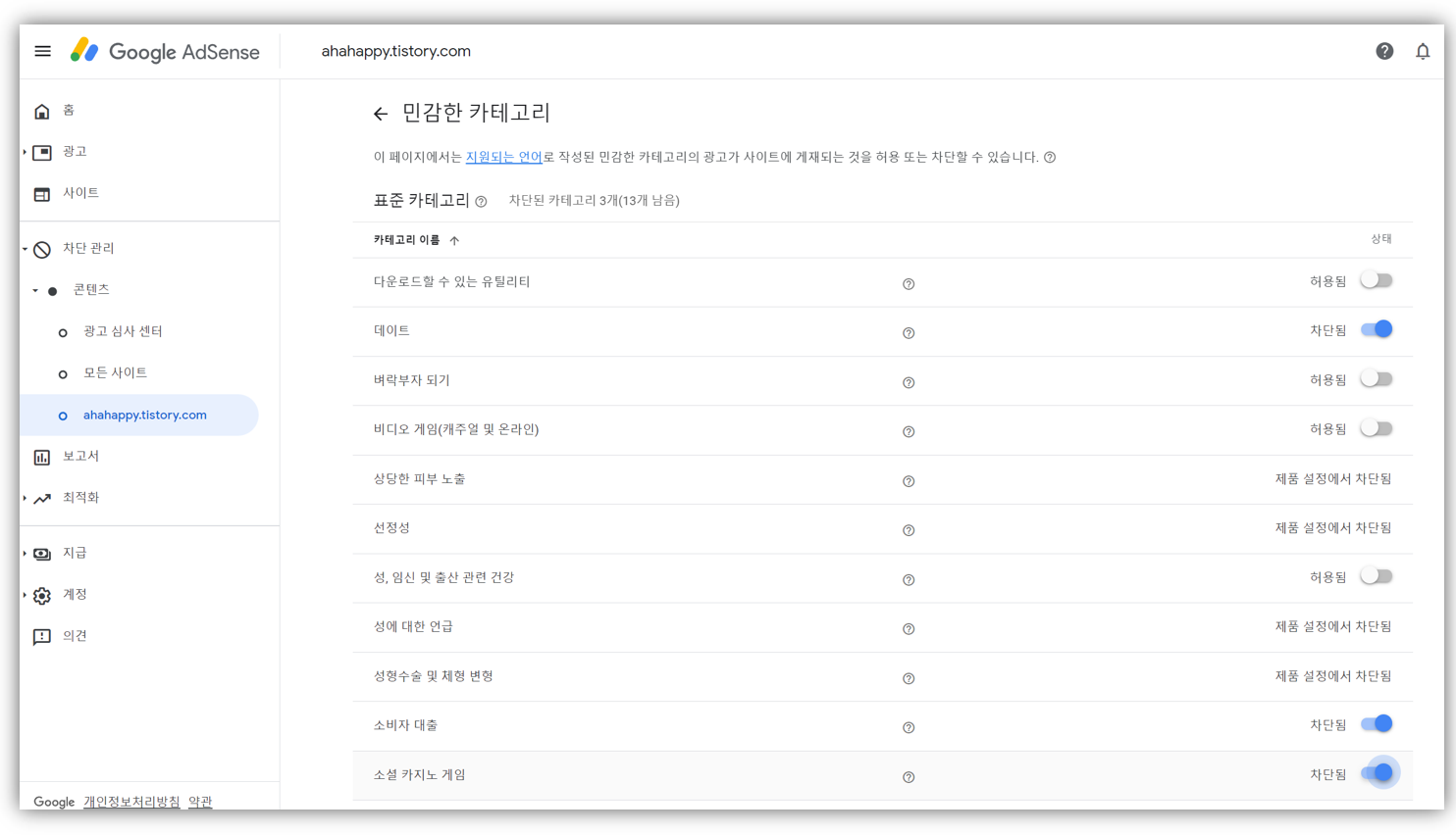 저는 블로그에 대출이나 성인 관련 콘텐츠가 뜨는 것이 싫어서 일부 광고들은 차단하였습니다. 광고를 차단하는 방법은 구글 애드센스에 들어가 [차단 관리]에서 블로그 url을 클릭하고 차단하고 싶은 카테고리를 선택하여 [차단함]으로 설정합니다.