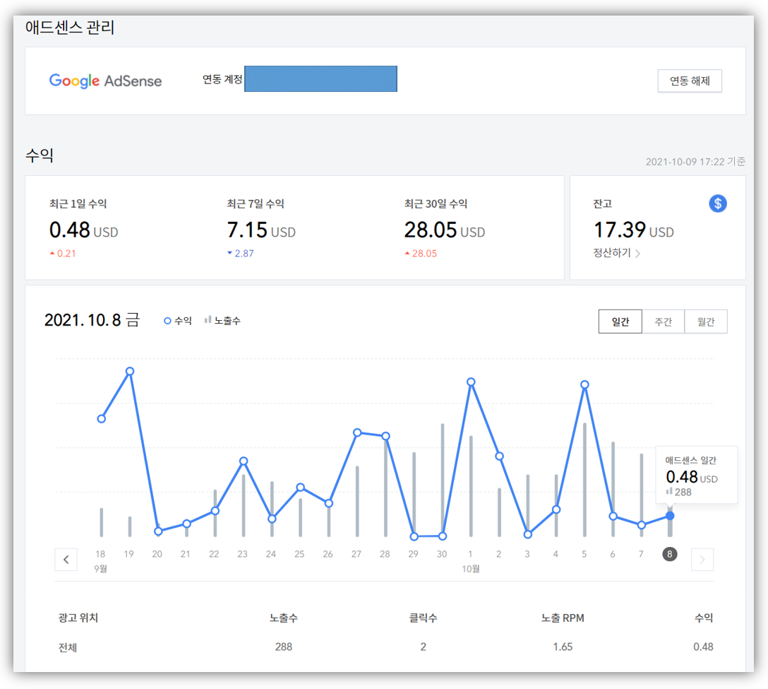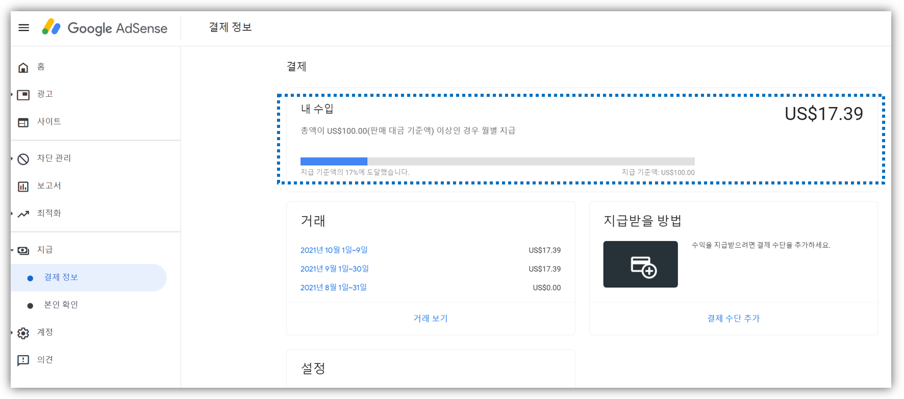 [결제 정보]를 확인하면 현재까지 적립된 수익이 보입니다. 17.39달러입니다. 9월 14일에 애드센스 승인을 받았으니 현재 25일 정도의 수익입니다. 구글 애드센스는 100달러가 되면 수익을 지급합니다. 100달러의 17%가 달성되었습니다. 한 달 20달러 정도로 예상하면 5달이 지나면 수익금 지급 신청을 할 수 있을 만큼 모을 수 있을까요?