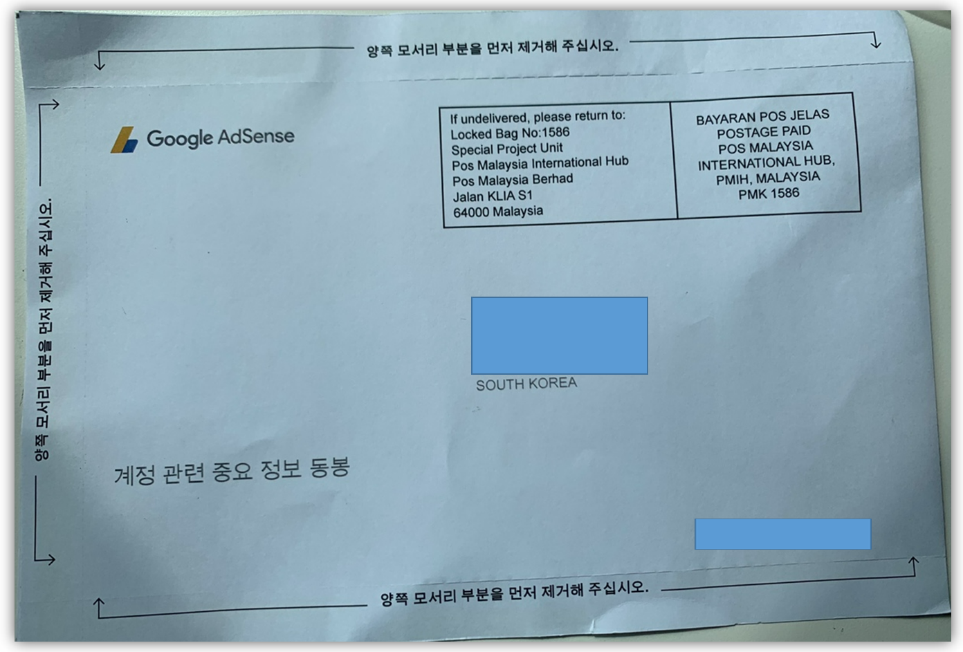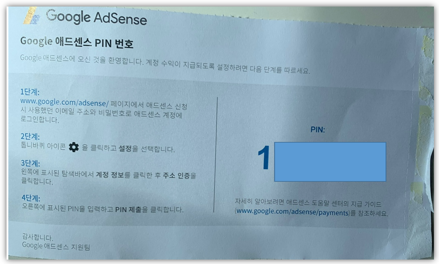 봉투를 열어보니 핀번호 여섯 자리가 적혀 있습니다. 그리고 핀번호를 구글 애드센스 홈페이지에서 입력하는 방법이 자세히 설명되어 있습니다.