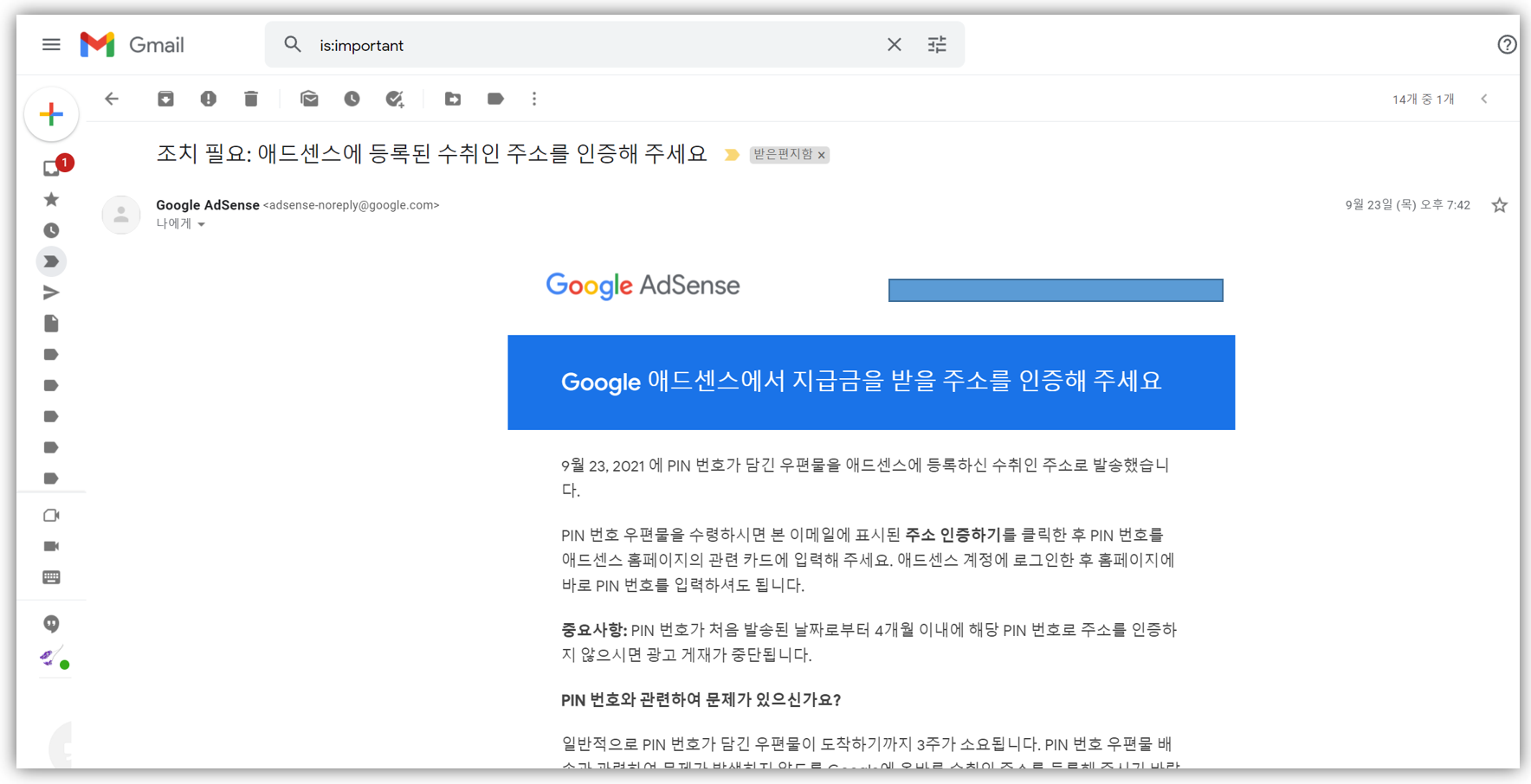 구글 애드센스 신청 완료 메일을 받고 9일 지난 9월 23일에 구글로부터 핀 번호가 발송되었다는 메일을 받았습니다. 핀 번호는 종이 우편물로 오기 때문에 구글 애드센스 회원 가입 시 집 주소를 정확하게 입력해야 분실되는 불상사를 방지할 수 있습니다.
