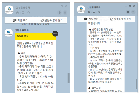 하지만 주식 상장일은 11월 19일입니다. 상장이 되어야 거래가 가능하고 이때까지 오늘자 주가인 6,130원을 유지하고 있다면 이익이 나겠지만 앞서 살펴본 것 같이 신주가 상장되면 주식수 증가에 따른 부담으로 주가가 많이 하락합니다. 특히 투자금 부족 등으로 인한 경우 기업의 경영 상태가 좋지 않기 때문에 주가가 훨씬 낮아질 수 있습니다. 그래서 상장일 당일에 주가가 6,000원 아래로 떨어지면 신주인수권을 매도하고 청약을 하지 않는 것이 훨씬 유리한 것입니다.