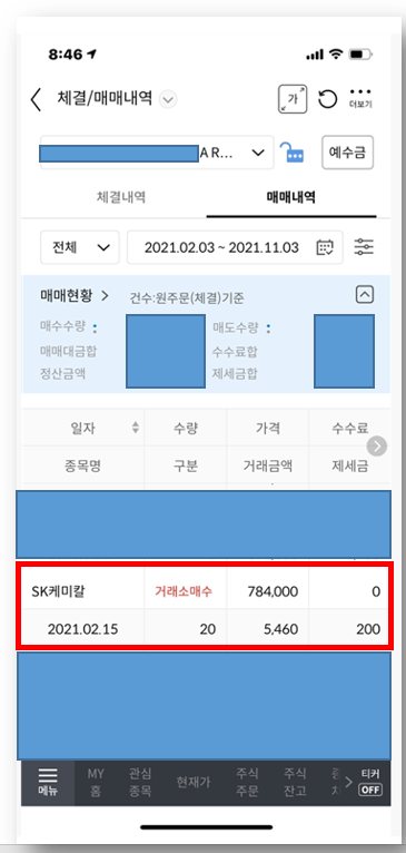 그런데 2월 어느날 출근 전에(매매내역을 확인해보니 2월 17일입니다) TV에서 SK케미칼이 코로나 백신을 위탁 생산한다는 뉴스가 나오는 것입니다. '우와! 이건 기회잖아!!' 개장을 하자마자 SK케미칼 주식을 392,000원에 2주를 샀습니다. 그런데 무슨 일인지 그 뒤로 주가가 떨어지기 시작합니다. 그런데 주식은 오르락내리락하는 거니 언젠가 오르겠지?라고 생각하며 지냈는데 계속 떨어지는 것입니다.