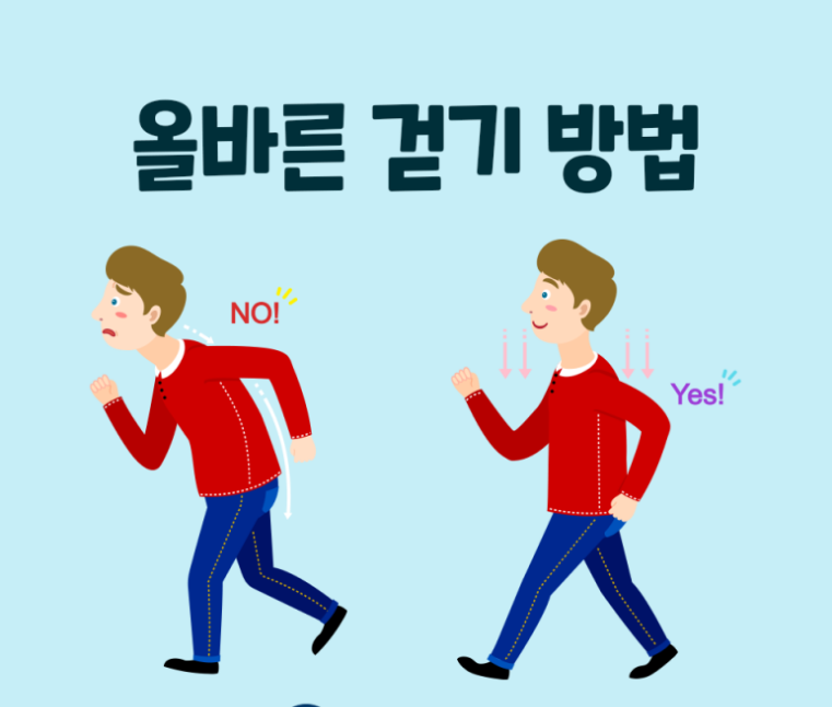 바른 자세로 허리를 곧게 펴고 전당 30m 정도를 바라보면 걷게 되면 척추 주변과 허벅지, 허리둘레의 근육을 건강하게 하여 척추를 건강하게 유지시켜 줍니다.