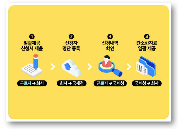 이후 회사가 신청자 명단을 국세청 홈택스에 등록합니다. 다음에 근로자는 국세청 홈택스에 접속해 '일괄 제공 신청내역'을 확인하고, 회사에 제공하고 싶지 않은 정보가 있다면 삭제합니다.