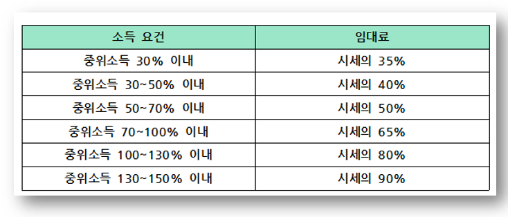 임대료 상한을 의미하는 표준 임대료는 주변의 전·월세 시세를 기준으로 정하게 됩니다. 이를 기준으로 실제 임대료는 소득 수준에 따라 시세의 35~90% 범위에서 차등 결정됩니다.