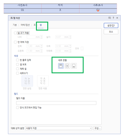 2. 아래 그림처럼 [표/셀 속성] 화면에서 메뉴 탭에서 [셀]을 선택합니다. 가운데 부분의 [속성]에서 [세로 정렬] 메뉴 중 위, 가운데, 아래 중 원하는 정렬을 선택하면, 표 안에서 글자의 위치를 설정하여 원하는 대로 정렬할 수 있습니다.