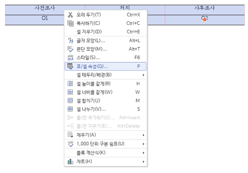 1. 우선 정렬하기를 원하는 셀 전체를 선택하고 마우스 우클릭을 합니다(셀을 선택하고 단축키 P를 사용해도 됩니다). 아래 그림처럼 메뉴가 나오면 [표/셀 속성]을 선택합니다.