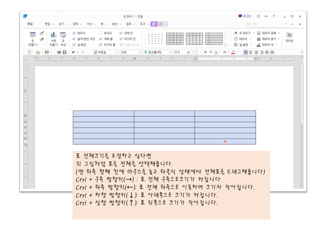그 후 Ctrl 버튼을 클릭한 상태에서 좌우상하 방향키를 누르면 그 방향으로 표가 전체적으로 커지거나 작아집니다.