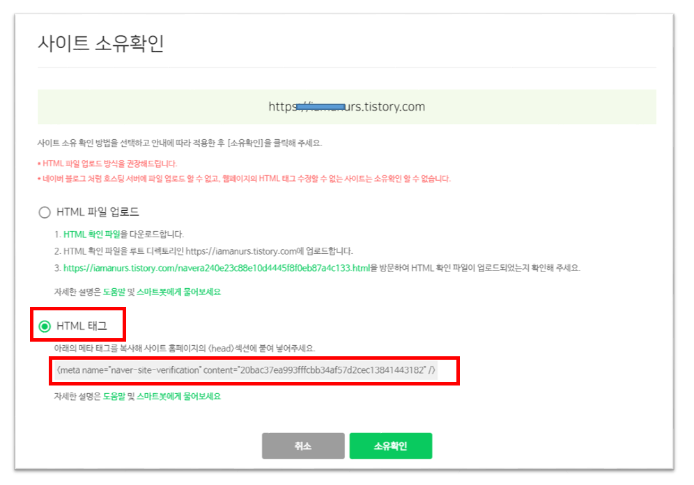 2. 사이트 소유 확인은 HTML 파일 업로드, HTML 태그, 2가지 방법으로 할 수 있는데, 티스토리는 HTML태그로 하는 것이 매우 쉽고 편리합니다. 아래 메타태그를 마우스로 드래그해서 복사합니다.